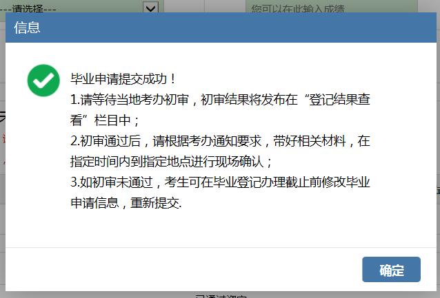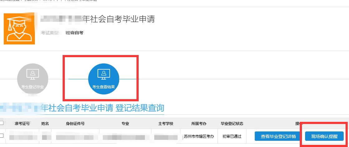 网上提交申请后,考生须及时关注审核结果。考生可在“考生查看结果”功能中的【现场确认提醒】一栏查看审核意见,初审通过的考生按所辖区考办要求在规定时间内到指定地点提交毕业材料。