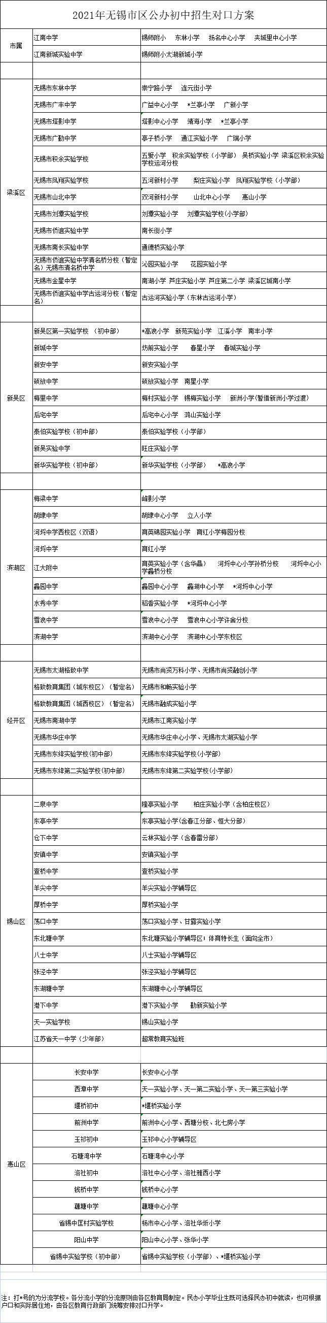 2021年无锡市区公办初中招生对口方案